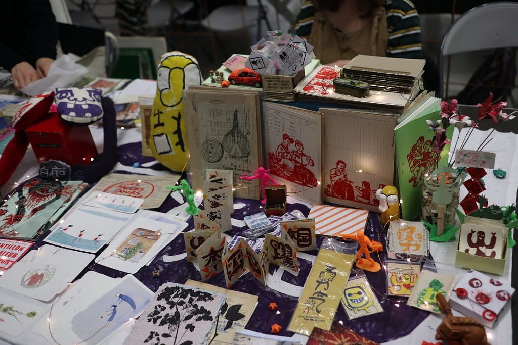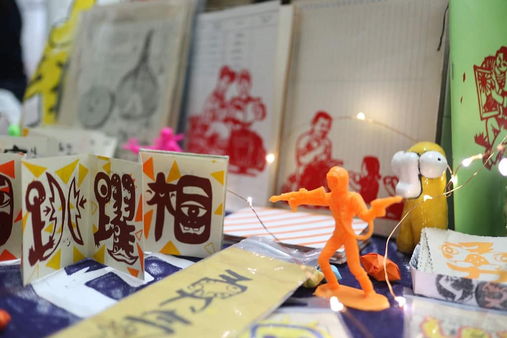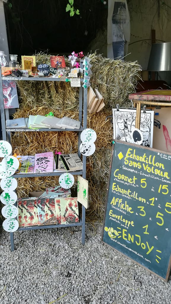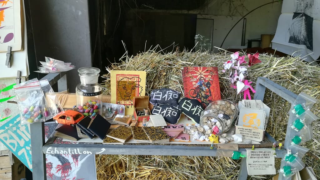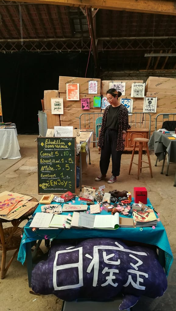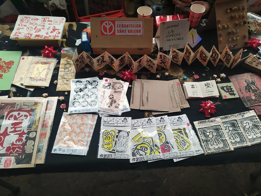 Stand pour différents événements, vente de produits créés par différents artistes (Affiches, patchs en tissu, peluches, fanzines…).